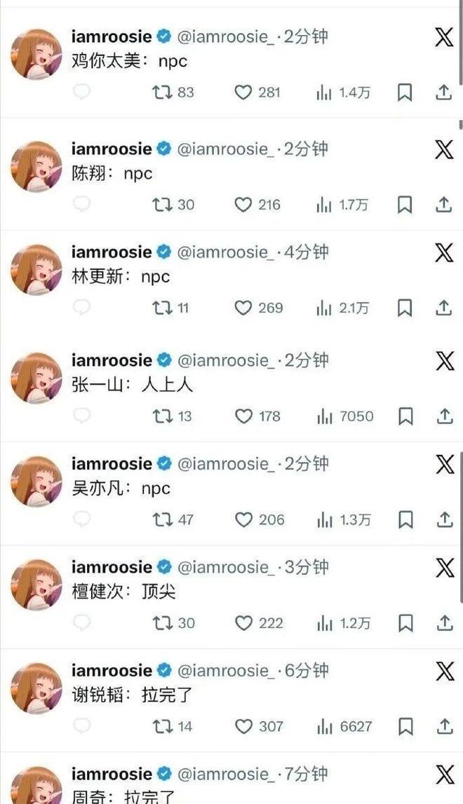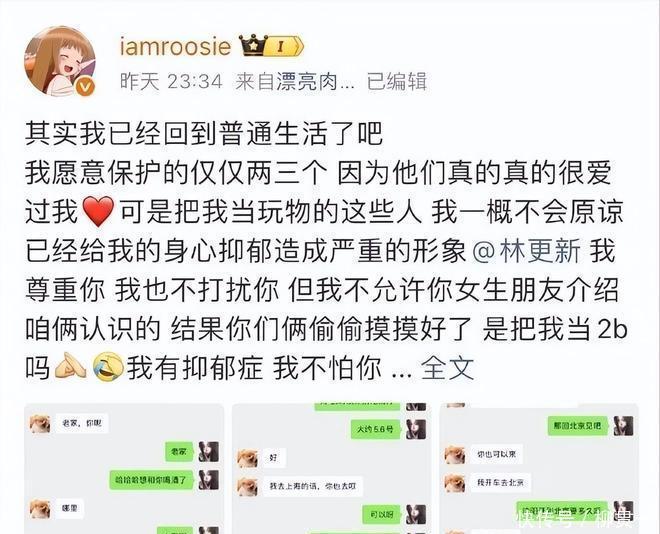 爆料内容简直比小说还离谱。说李汶翰喜欢PUA,把感情玩得花里胡哨;秦霄贤爱搞外遇,不走寻常路;檀健次甘愿当舔狗,情场小可怜一枚;林更新更狠,直接拿她当玩物;张一山倒像个暖男,没事就给她买零食;鹿晗那段,和她一张床拍自拍,想象空间直接拉满。关晓彤也没能逃过,她还阴阳怪气地补刀一句“关晓彤肯定和王安宇恋爱了”。理由嘛?就一句“姐有抑郁症,谁也不怕”。疯起来连自己都拦不住,何况旁人。